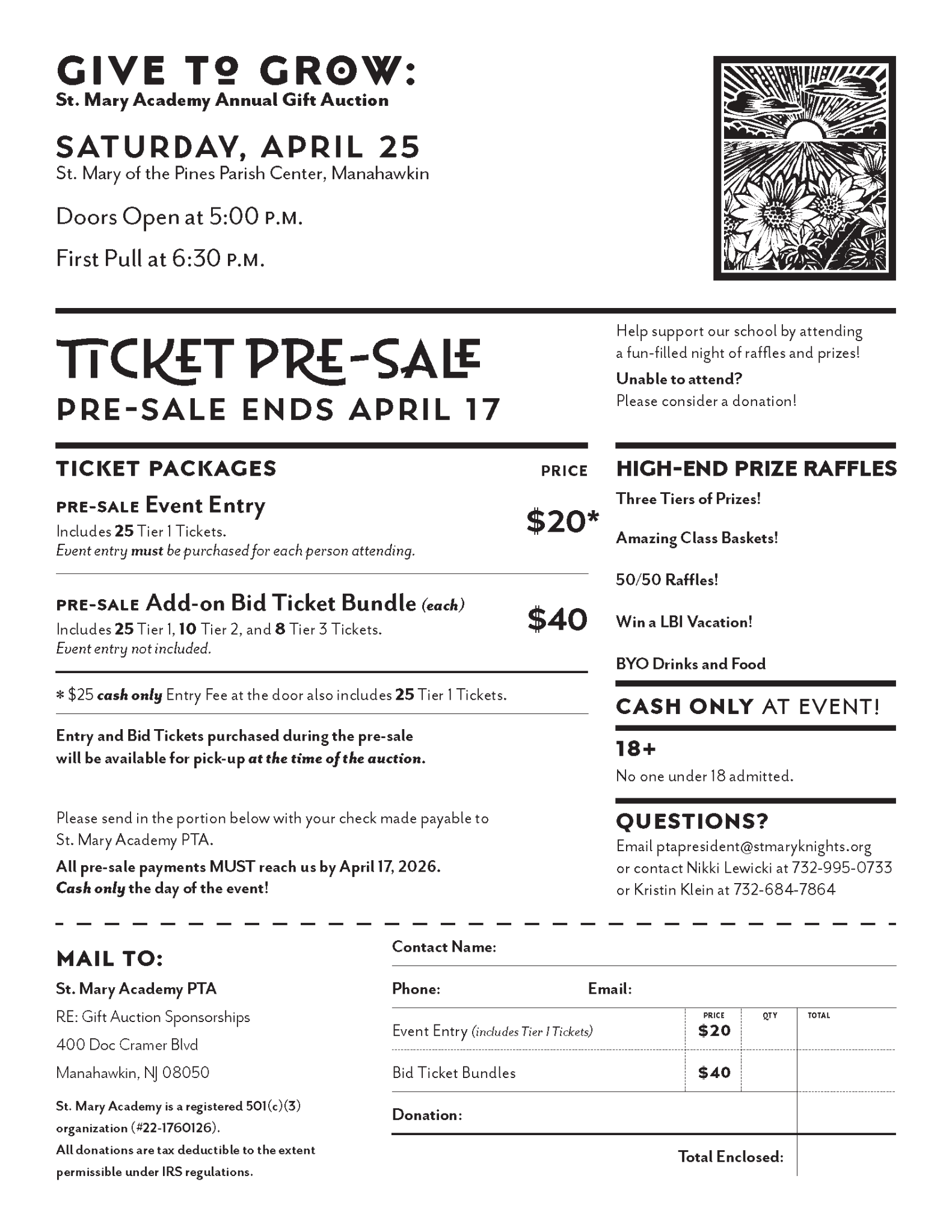 PRE-SALE Deadline (must be received by) Friday, April 17th (Pre-sale will start around March 30th)